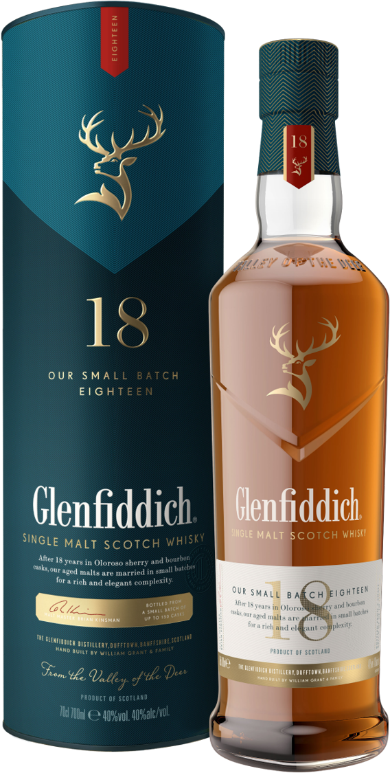 Glenfiddich 18 ans Small Batch Reserve : Arômes de pomme cuite, de cannelle, de fruits secs et de chocolat noir. Sa texture soyeuse et sa complexité en font un whisky d’exception.