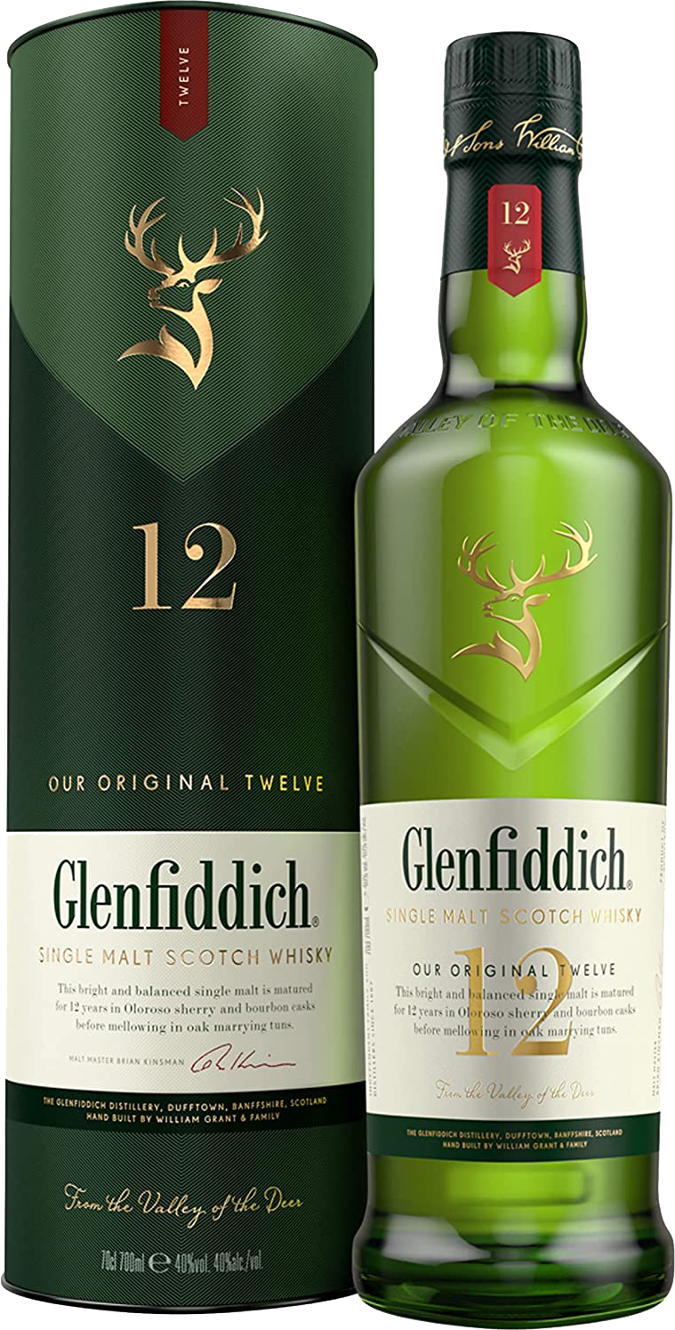 Glenfiddich 12 ans : Vieilli en fûts de chêne américain et européen soigneusement sélectionnés, il offre un whisky équilibré, marqué par des arômes de poire fraîche, de notes florales et une finale délicatement boisée.