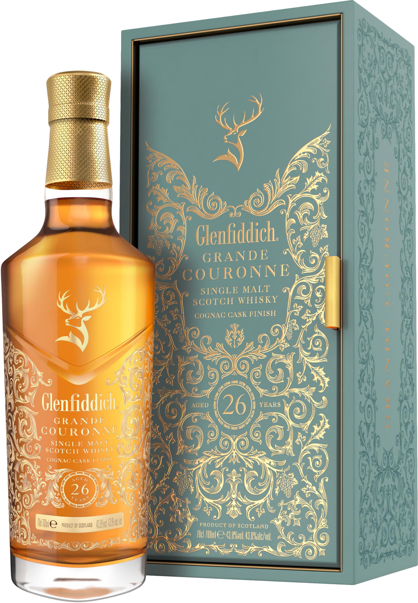 Glenfiddich 26 ans Grand Couronne : Riche et opulent, il déploie des arômes de café, de chocolat noir, de fruits confits et d’épices nobles.